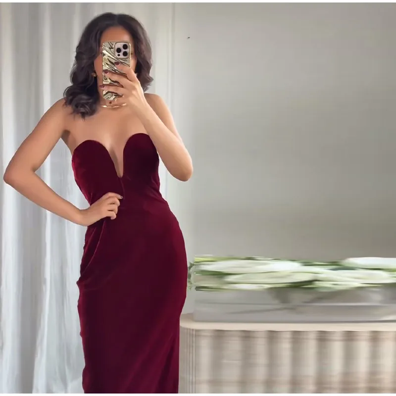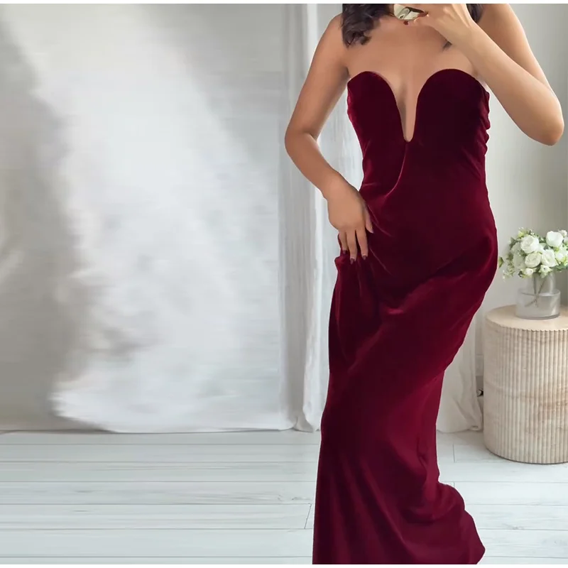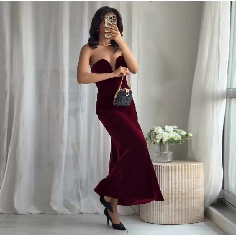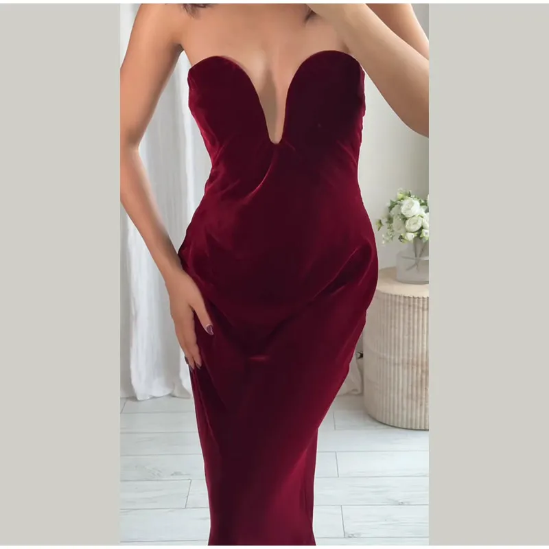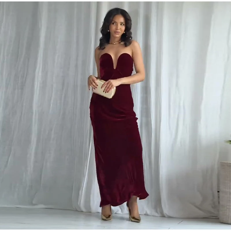 Burgundy Velvet Strapless Maxi Dress Sweetheart Neckline Side Zipper Bodycon 2025 Evening Elegant Women Dresses Party Lady Gown