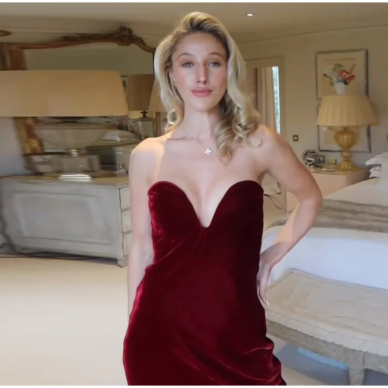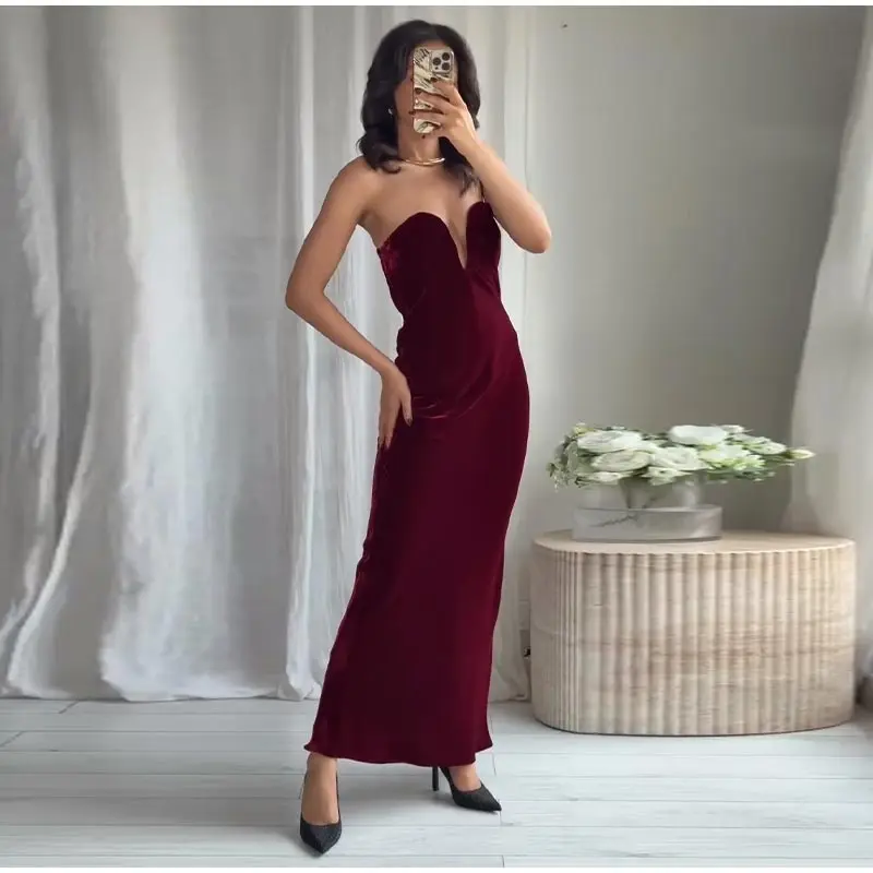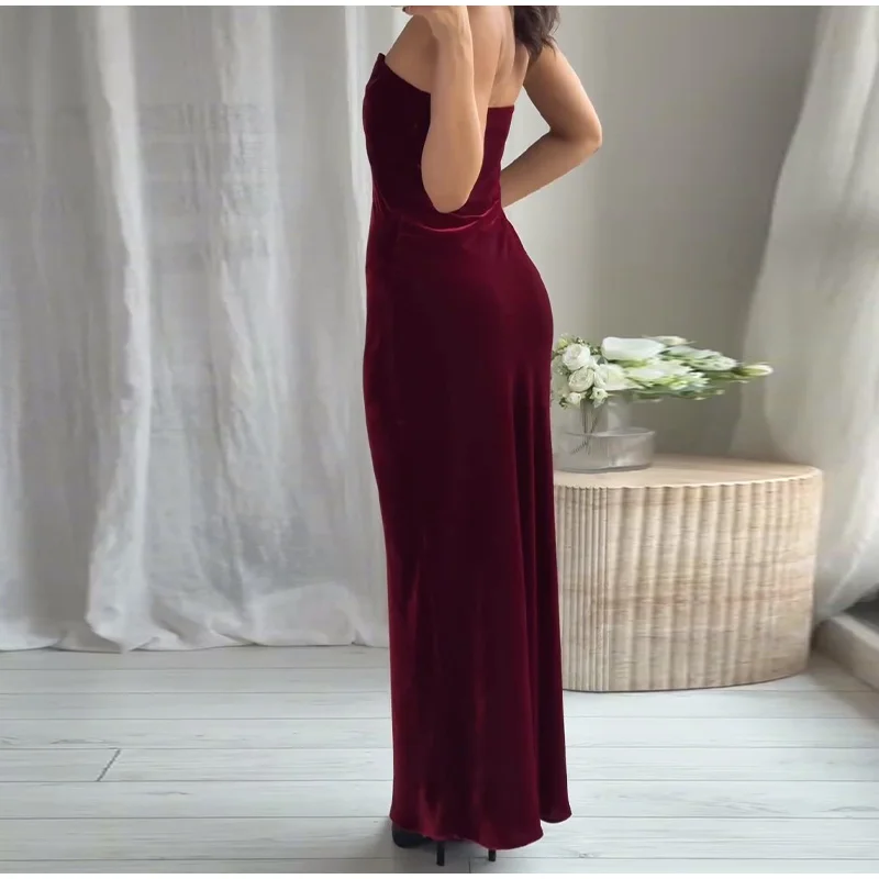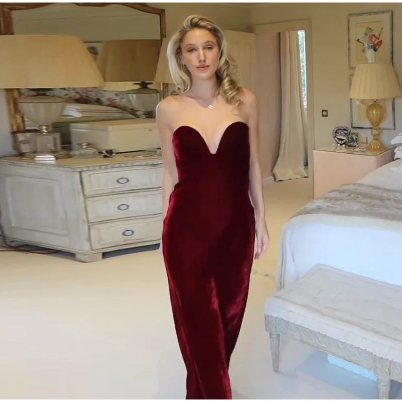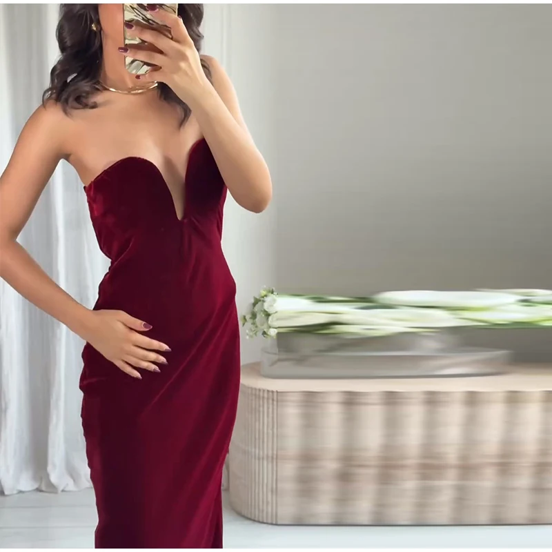 Burgundy Velvet Strapless Maxi Dress Sweetheart Neckline Side Zipper Bodycon 2025 Evening Elegant Women Dresses Party Lady Gown